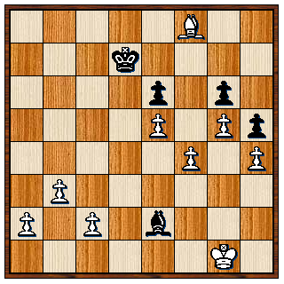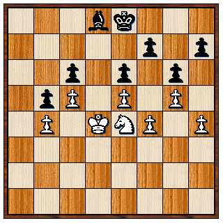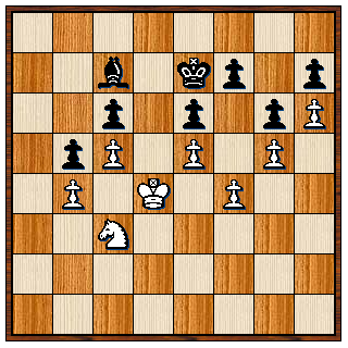 Zwart kan natuurlijk helemaal niets, behalve zijn loper weggeven. Hij beperkte zich tot het heen en weer spelen van zijn koning tussen e8 en f8. Je kunt zien dat als het witte paard naar f6 gaat dan wordt het geslagen en zolang zwart de witte koning van d6 af kan houden is het potremise. Wit wist nog zijn h-pion op te spelen naar h7 en zwart dacht zich de volgende stelling te kunnen veroorloven: