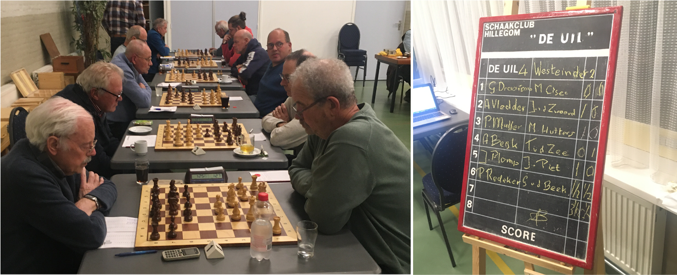 Nadat het 4e team in hun NHSB competitie eerst een team van Hoofddorp in Hoofddorp tegenkwam, vanwaar zij met minimaal (maximaal?) verlies moesten terugkeren kwam 3 november het 2e team van Westeinder naar Hillegom. Beide teams waren op papier (gemiddelde rating van 1645 vs 1631) en op de borden aan elkaar gewaagd. Piet won als eerste. Jan P. en Aad wisten ook het volle punt te scoren. Pim wist een waardevol halfje voor het team te behalen, waardoor de score voldoende werd en André en Gerard zich hun nederlaag gelukkig konden permitteren. De eerste matchpunten voor de Uil 4 zijn binnen.
