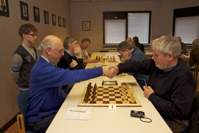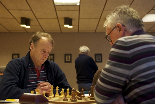 Piet Muller won als een grootmeester tegen Ray Claret. Reti zou trots zijn geweest op onze nestor. Het paard op d6 was een Olifant. Anton stond iets beter tegen de isolani van Terry Douse, maar remise was een mooi resultaat. De beste gastheer was en bleef Jan Plomp, die de altijd vrolijke Peter Baker (zie de foto’s) de zege schonk. Overigens niet zonder slag of stoot.
