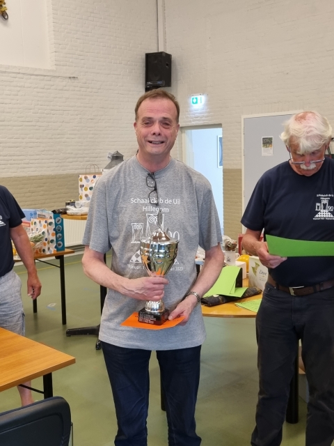 Van de bekers was er één die voor de derde keer (dus definitief) gewonnen kon worden. En hoewel de wedstrijdleiding er alles aan gedaan heeft om de Brauchmann trophee te behouden heeft Rob Groot het toch voor elkaar gekregen (zie groep 12) om de beker voorgoed te winnen. Klasse, want ik had hem door verschuivingen echt wat hoger ingedeeld. Het trieste feit doet zich voor dat al enkele jaren de Dirk Kaptein beker op de nominatie stond om definitief gewonnen te worden (voor de 5e keer) door Jeroen Frijling. Helaas is Jeroen in december 2022 overleden en is hem die eer dus nooit gegund. In zijn toespraakje vlak voor de laatste ronde memoreerde Peter nog even dit overlijden. Jeroen was een aimabel mens, deed al ruim 20 jaar aan onze toernooien (dikwijls 3 Uil-toernooien per jaar) mee. Wij zullen hem heel erg missen.