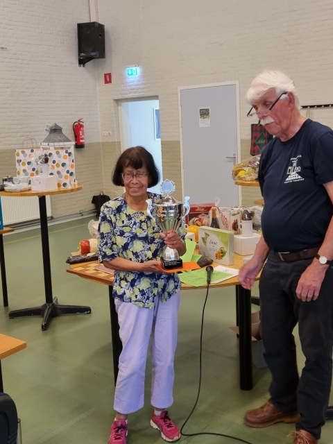 Voorzitter Jan Plomp bedankte in zijn slotwoord, de wedstrijdleiding Cok en Peter, en uiteraard werden ook Hannie, Lyda en Bert van achter de bar naar voren gehaald en met een “bloemenbon” voor de dames en een bijpassend drankje voor Bert, bedankt voor hun goede zorgen dit toernooi.